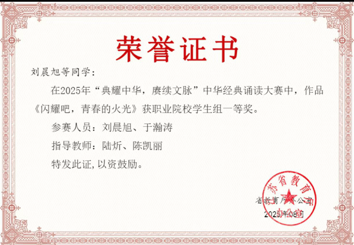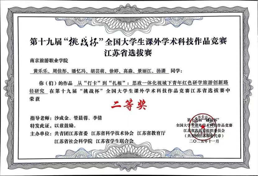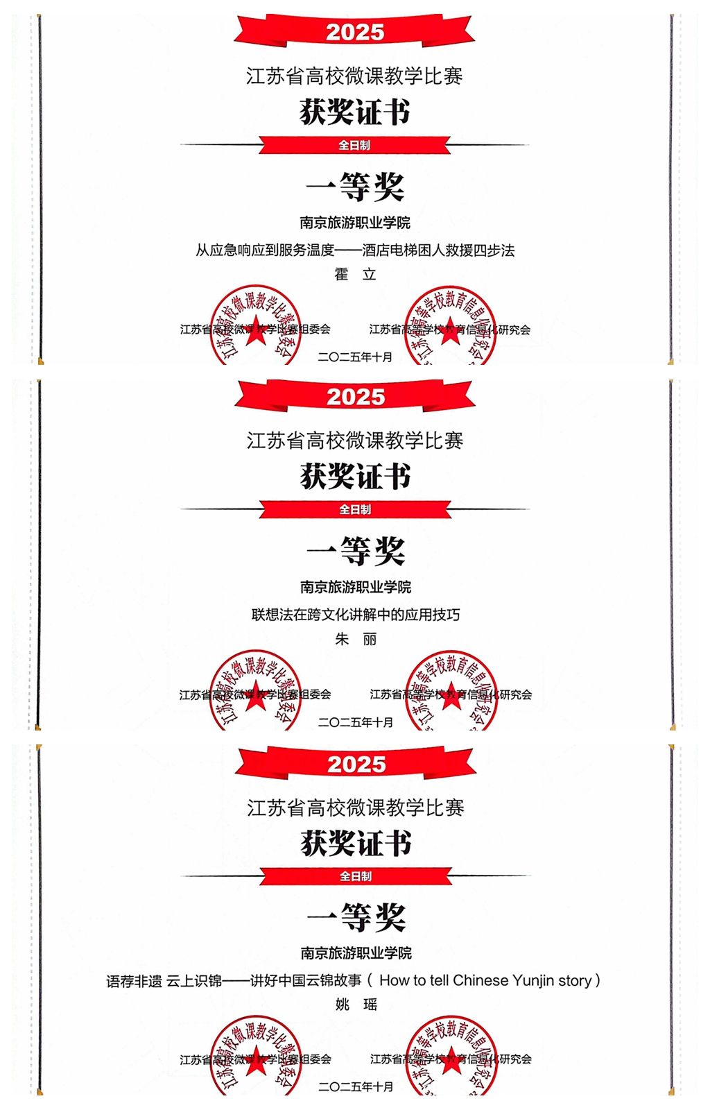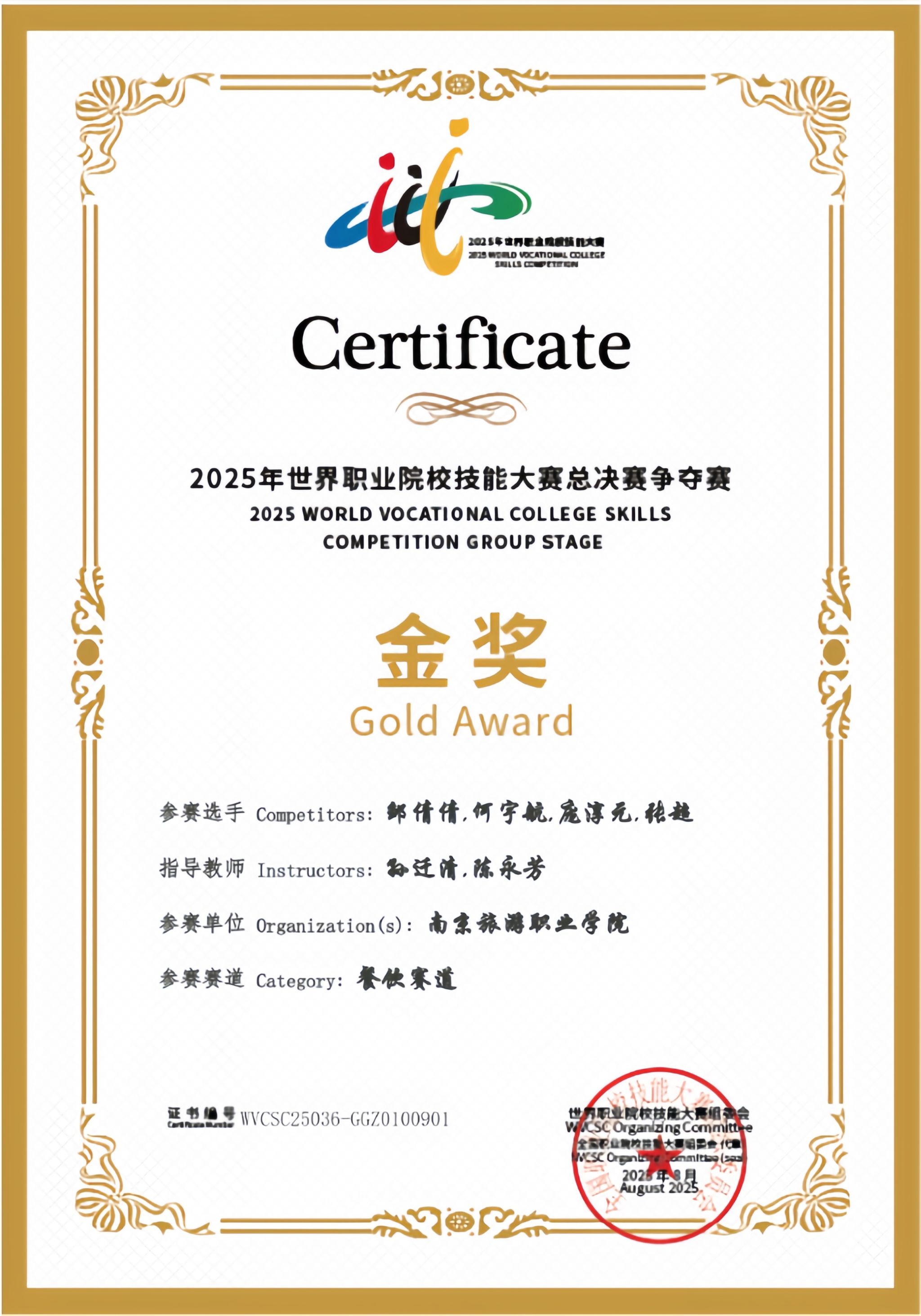 学生在各类大赛中斩获优异成绩,树立职教标杆。在2025年世界职业院校技能大赛中,学生勇夺总决赛争夺赛金奖2项,首次跻身冠军总决赛并获得优胜奖,实现了全国旅游类院校在该项目中的历史性突破。继2024年荣获第一届全国大学生职业规划大赛总决赛职教组就业赛道金奖后,2025年,在第二届全国大学生职业规划大赛总决赛职教组成长赛道中夺冠。2025年省职业院校技能大赛斩获一等奖8项、二等奖1项、三等奖4项,获奖数量与质量均居全省前列。获2025年江苏省大学生戏剧展演短剧竞赛单元非专业组二等奖,中国国际大学生创新大赛(2025)职教赛道省赛三等奖3项,获第十九届“挑战杯”中国大学生课外学术作品竞赛江苏省选拔赛二等奖1项、三等奖3项,获全国“高教社杯”短视频大赛特等奖1项,第26届FHC中国国际烹饪艺术比赛获2金1银,获省第二十一届运动会高校部比赛铜牌1枚,南京市大学生田径运动会金银铜牌各1枚。
