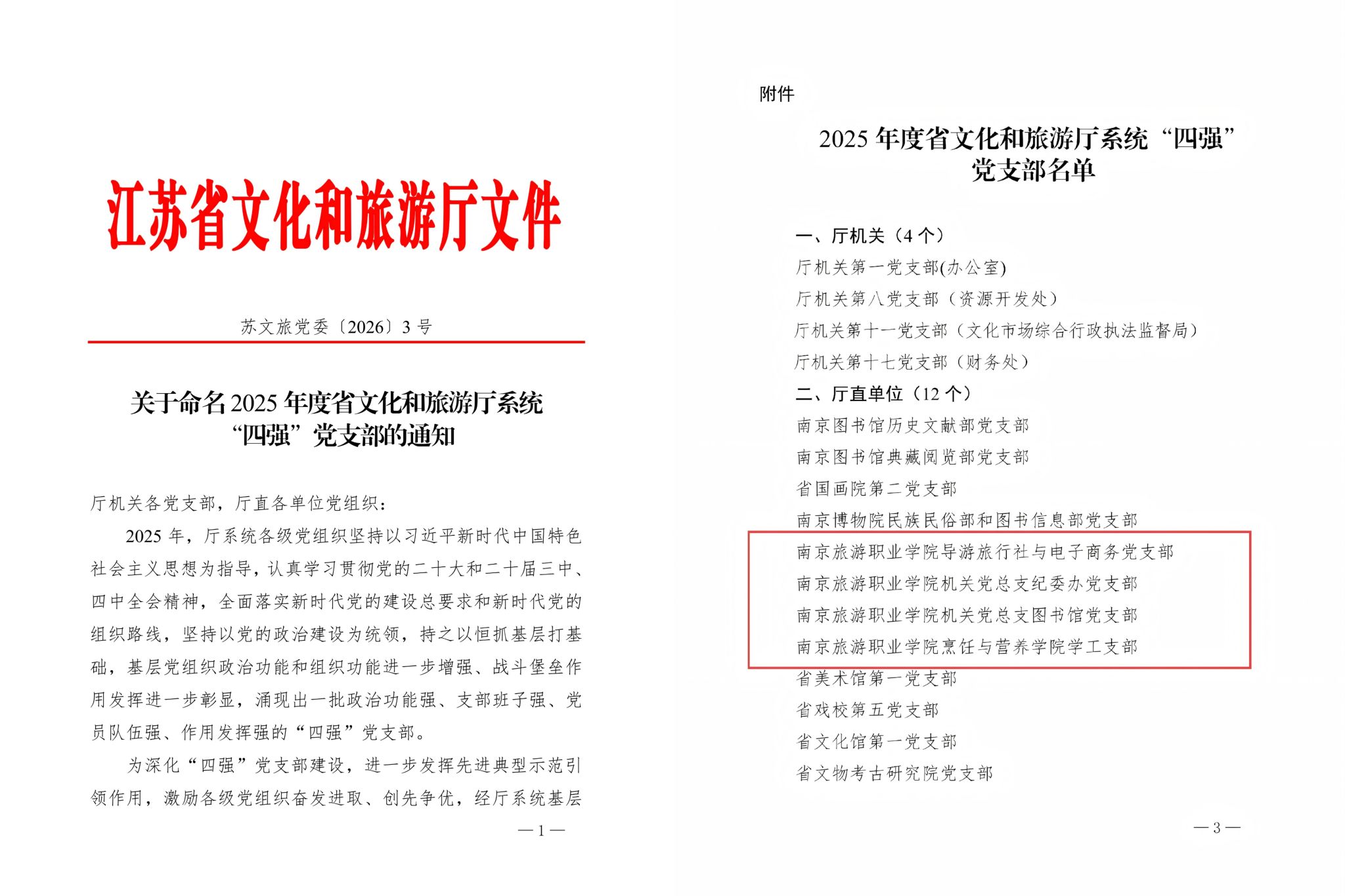 近日,江苏省文化和旅游厅公布了2025 年度厅系统“四强”党支部名单,伟德国际victor1946旅游管理学院导游旅行社与电子商务党支部、机关党总支纪委办党支部、机关党总支图书馆党支部、烹饪与营养学院学工党支部4个党支部获评厅系统“四强”党支部。