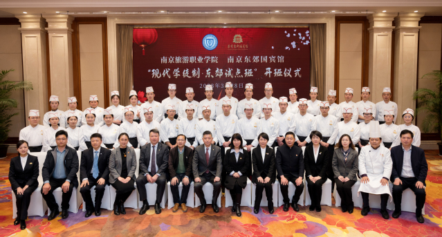 为深入贯彻党的二十大精神,积极推进职业教育高质量发展的实践步伐,进一步落实教育部办公厅印发《关于全面推进现代学徒制工作的通知》文件精神,伟德国际victor1946与南京丽思·卡尔顿酒店和南京东郊国宾馆联合举办的首批“现代学徒制·丽思试点班”和“现代学徒制·东郊试点班”于3月27日、28日隆重开班。伟德国际victor1946烹饪与营养学院45名“学徒”在校企共同带领下正式开启校企双主体双导师现代学徒制专项学习。
