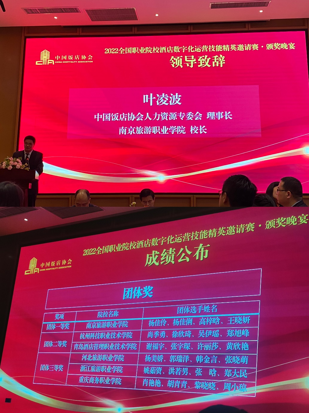 2023年3月28-4月1日,由中国饭店协会主办的“2022年全国职业院校酒店数字化运营技能精英邀请赛”在杭州职业技术学院隆重举行。来自全国9所高职院校参加比赛,我们酒店管理学生团队以团队总分第一的好成绩,荣获团体一等奖及数字化运营沙盘博弈冠军。