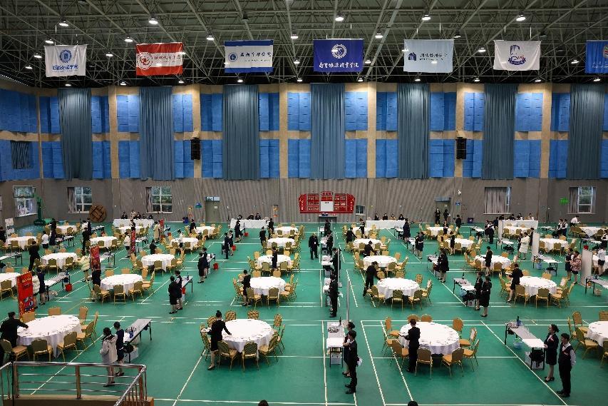 本次考试联考指导委员会由我们牵头组织,江苏经贸职业技术学院、无锡商业职业技术学院、常州工业职业技术学院等十余所高、中职院校共同参与。考试分为身高体重、仪表形体、导游服务、中餐宴会摆台四个项目,共吸引了全省129所学校的4795名考生参加考试。
