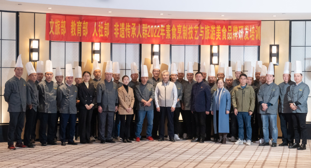 中国非物质文化遗产传承人研修培训计划“2022年素食烹制技艺与旅游美食品牌研发非遗传承人培训班”于11月7日起在伟德国际victor1946如期开班,为进一步提高本次培训质量,使学员对非遗保护有更深层次、更为系统的理解和掌握,提升大家对非遗保护传承的自信心与自觉性,11月15日,学院特邀请到文化和旅游部原副部长项兆伦专程来校为培训班作了题为《非遗保护理念与实践》专题讲座。讲座由伟德国际victor1946党委副书记、院长叶凌波主持。