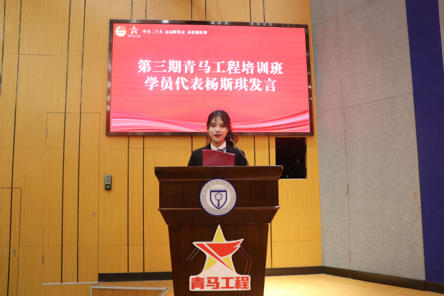 接着,第三期青马工程培训班学员代表杨斯琪发言。她希望大家通过社会实践、志愿服务、爱心互助等力所能及的行动,积极实践,争做敢于创新、追求新知、勇于担当的有为青年。