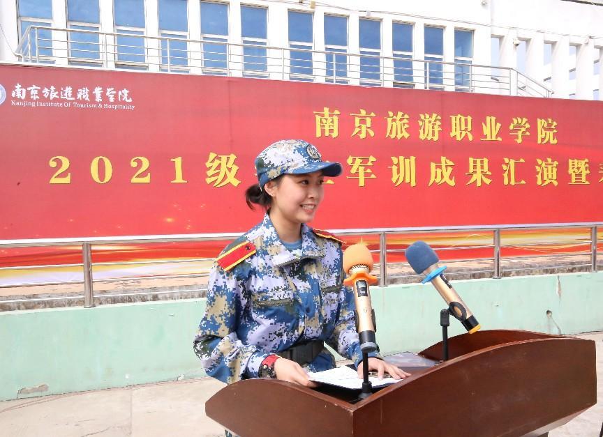 旅游管理学院21级旅游管理8班的强蔷作为军训优秀学员代表发言,她表示将珍惜美好的大学时光,继续发扬吃苦耐劳、勇往直前的军训精神,为学院的发展添砖加瓦,为社会的进步贡献力量。