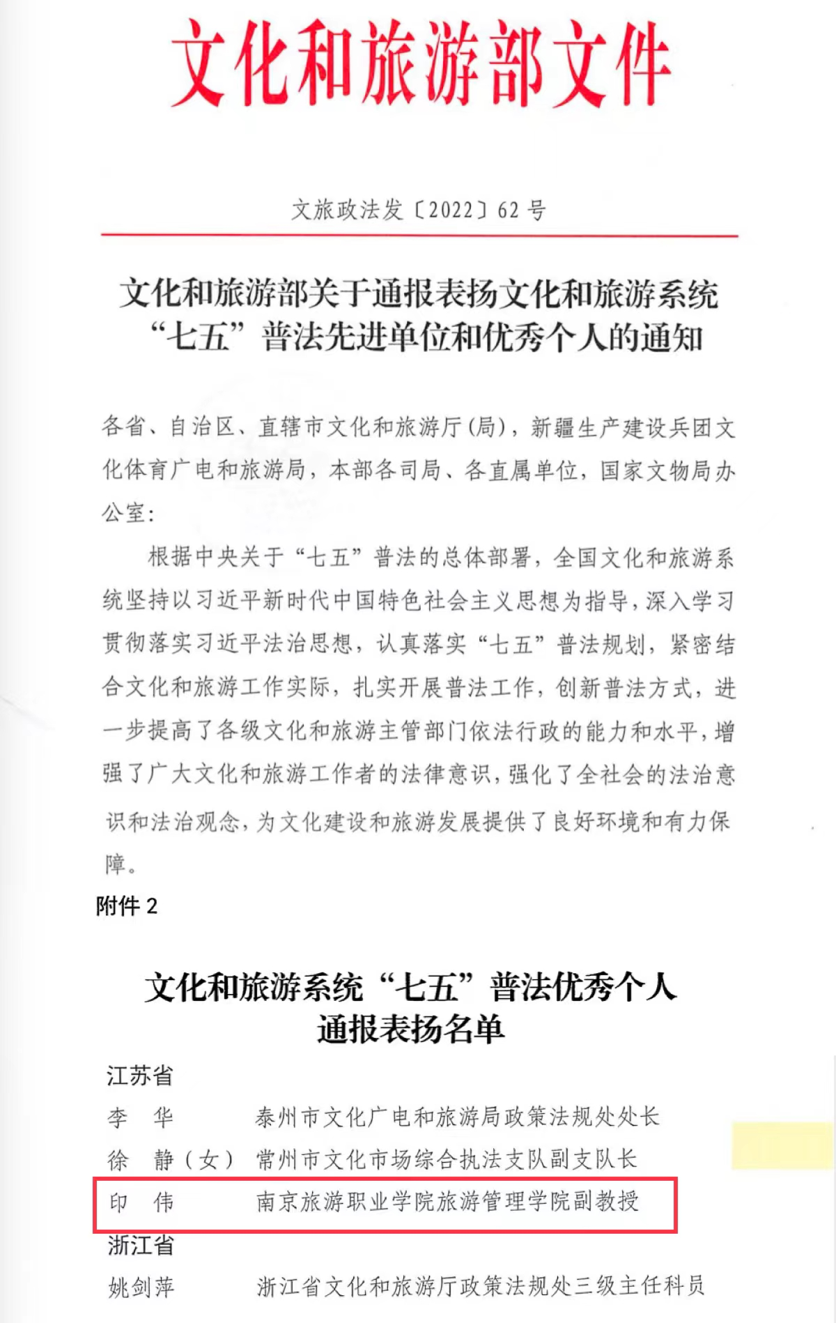 近日,文化和旅游部发布《文化和旅游部关于通报表扬文化和旅游系统“七五”普法先进单位和优秀个人的通知》,伟德国际victor1946副教授、江苏紫金旅游规划设计研究院院长印伟获评文化和旅游系统“七五”普法优秀个人称号。