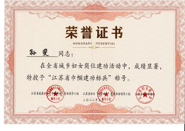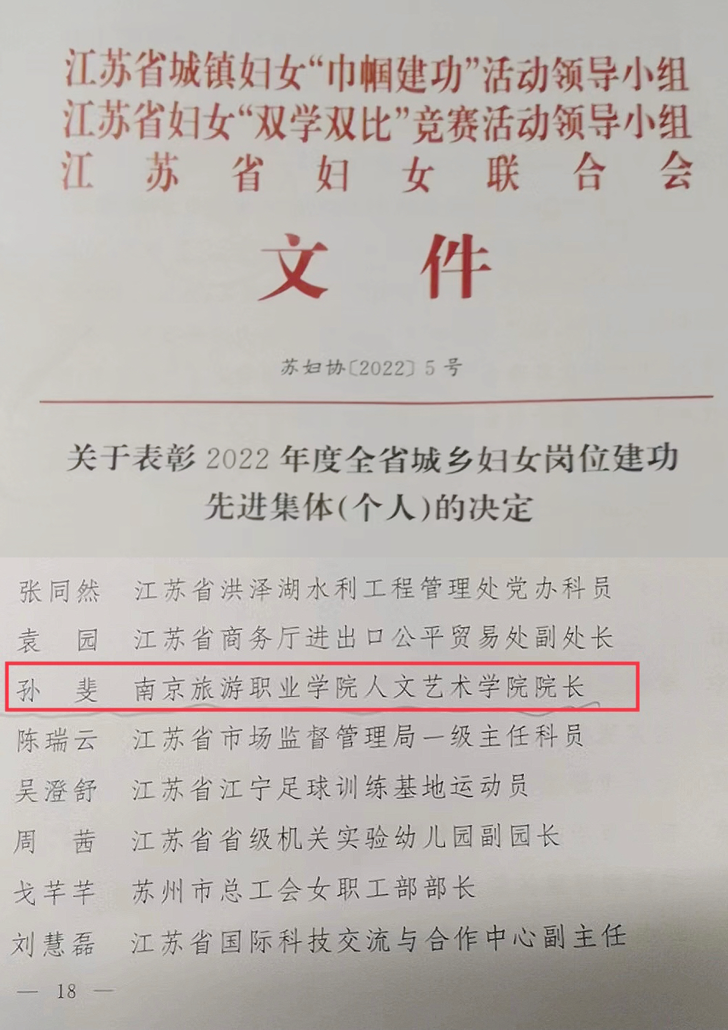 近日,江苏省城镇妇女“巾帼建功”活动领导小组、省妇女“双学双比”竞赛活动领导小组、省妇联联合发布《关于表彰2022年度全省城乡妇女岗位建功先进集体(个人)的决定》,我们人文艺术学院院长孙斐获评江苏省城乡妇女岗位建功先进个人。