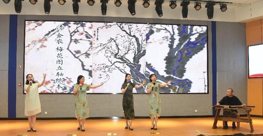 创新表现形式,“声”入师生心中。在以声传文、以情动人的同时,老师们还努力创新诵读形式,力求让诵读入耳、入脑、入心。《咏梅词》以诗词为载体,将朗诵、戏曲念白和乐器弹奏巧妙融合,赞颂梅之精神,号召教职工以梅为镜,践行教育报国梦。