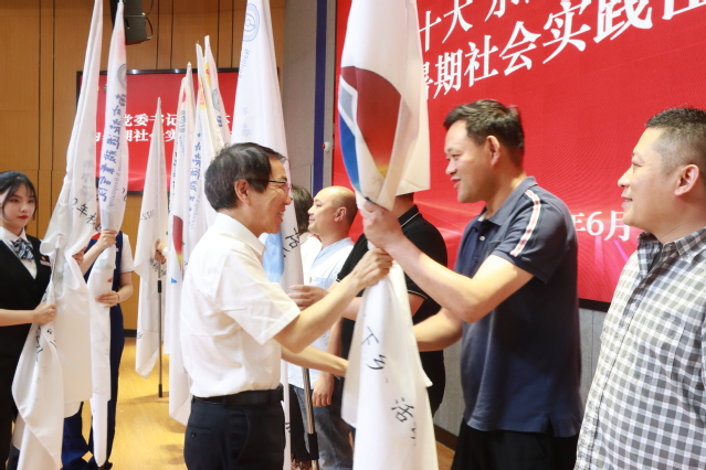 宣誓结束后,周春林为各实践团队授旗。伴随着击鼓声,各团队指导老师舞动旗帜,在师生们“喜迎二十大 永远跟党走 奋进新征程”的嘹亮口号声中,我们2022年暑期社会实践出征的号角正式吹响。