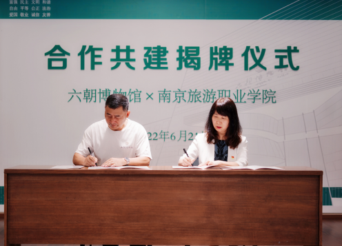 随后,双方领导签署了共建人文素养实践基地协议并共同为基地揭牌。在座谈环节,操阳副院长表示我们将积极投入师资与智力支持,以人文素养教育实践基地为基础,推进与六朝博物馆的专项合作及综合类合作,积极探索馆校合作长效机制,探索多专业探究式学习和实践的合作方式,努力形成利用博物馆资源开展旅游职业教育教学的最新成果。