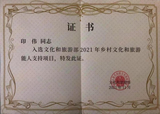 2021年,南京市浦口区星甸街道后圩村成功创建江苏省乡村旅游重点村,同年11月,文化和旅游部办公厅下发《关于印发2021年度乡村文化和旅游能人支持项目入选人员名单的通知》,经资格审核、专家评议、公示等程序,印伟入选“文化和旅游部2021年度乡村文化和旅游能人支持项目”,这些成果和荣誉均是对印伟最好的肯定。