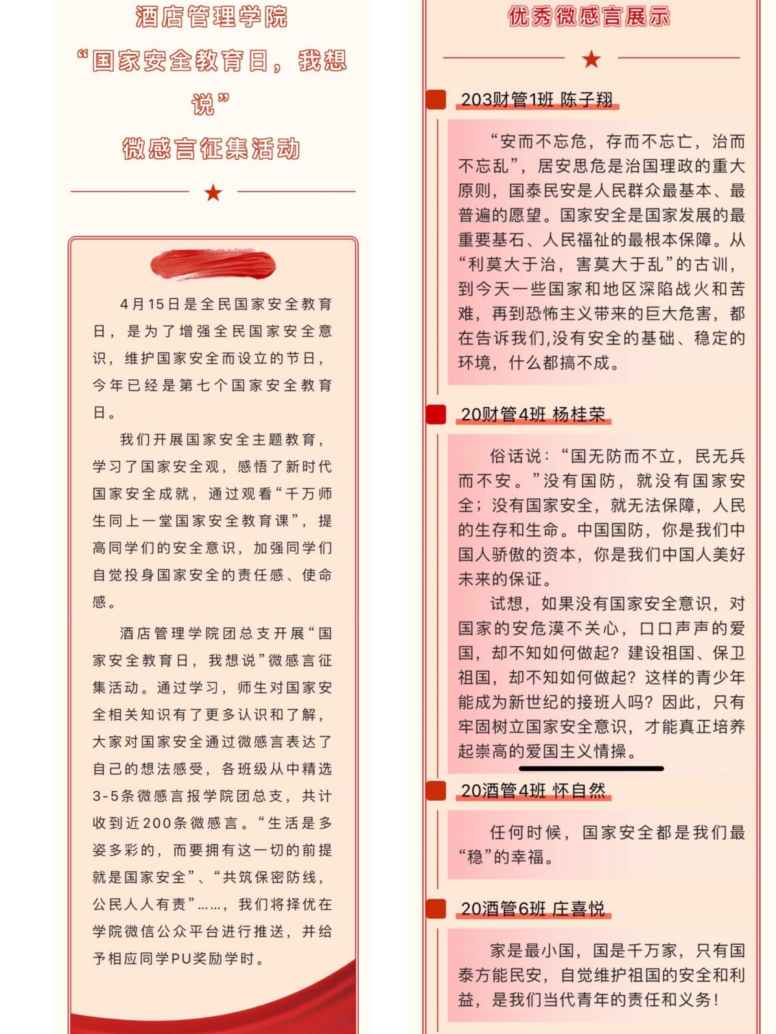 为进一步调动和激发同学们参与国家安全教育的积极性,学院大力拓展互动渠道和形式,举办不同内容的特色活动。“作为当代青年学生,我们应将维护国家安全作为自身使命,为国家尽一份责、出一份力”“从自身做起,从小事做起,为国家安全发挥自己的力量”,在酒店管理学院团总支开展的“国家安全教育日,我想说……”微感言征集活动中,同学们纷纷通过微感言表达自己的想法和感受,并表示要争做国家安全教育的宣传员,把学到的国家安全知识分享给更多的人。酒店管理学院党总支副书记陆华山表示,“维护国家安全,人人都有责任。在全民国家安全教育日,组织学生深入学习国家安全知识很有必要,也很有意义。通过开展微感言征集活动,让全体学生参与其中,做国家安全宣讲的主角,切实提高学生的国家安全意识。”