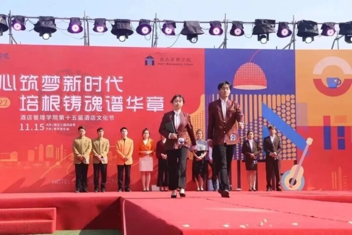 连续举办15届的酒店工装秀是酒店管理学院每年在专业文化节期间的重点活动。舞台上,学生们身着各大品牌酒店的工装,迈着自信的步伐,展现着专业的体态。该院副教授、酒店管理专业教研室主任田园介绍,除了传统的工装秀,学院还设置了饮品区,由老师带领学生运营。此外,学院还设置了智能化区域,通过财务机器人、大数据客房展示等方式,展示酒店管理运营数字化新技术。