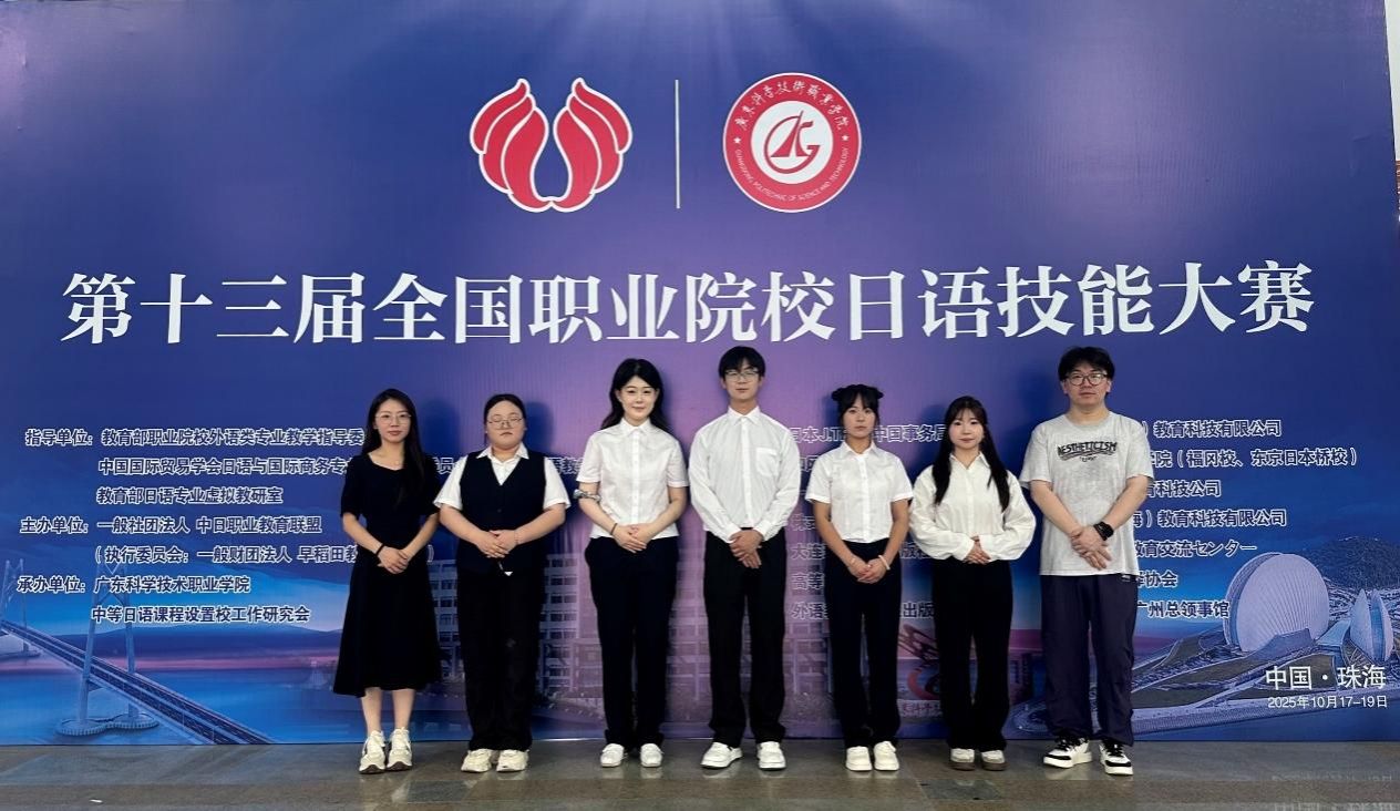 2025年10月17日至19日,第十三届全国高等职业院校日语技能大赛在广东珠海隆重举行。本次大赛由教育部职业院校外语类专业教学指导委员会、中国国际贸易学会日语与国际商务专业教学研究委员会(原中国日语教学研究会)、教育部日语专业虚拟教研室指导,一般社团法人中日职业教育联盟主办,广东科学技术职业学院与中等日语课程设置校工作研究会共同承办。我们旅游日语专业赵怀敏、徐耀威、张欣欣、蔡迪、杨宇庆五位同学参赛,与来自全国多所高等职业院校的选手齐聚一堂,展现日语技能与职业素养。