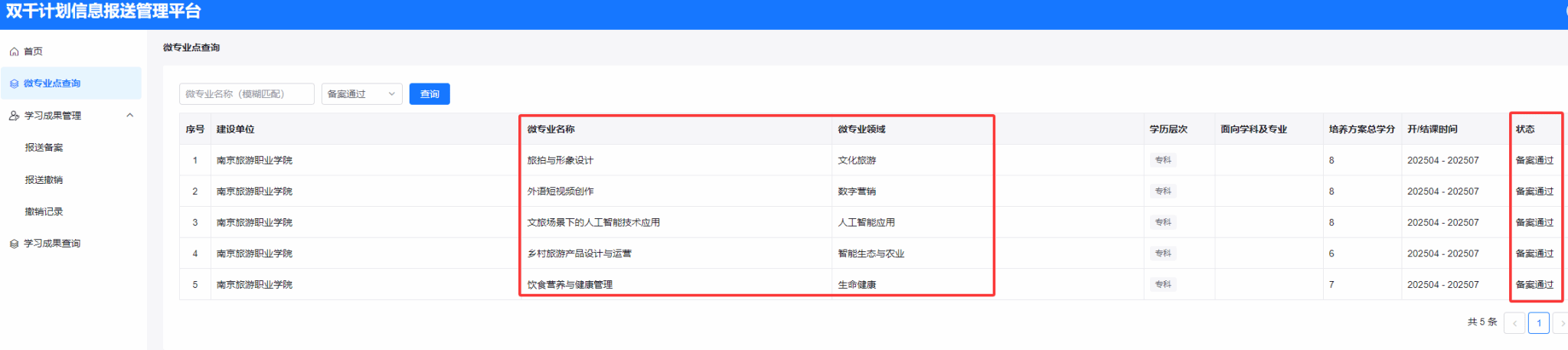 近日,教育部发布《关于上传首批入库“微专业”学生信息的通知》(教就业司函〔2025〕23号),我们申报的文旅场景下的人工智能技术应用、乡村旅游产品设计与运营、旅拍与形象设计、外语短视频创作、饮食营养与健康管理共5个微专业入选教育部“双千”计划首批入库名单并成功备案。