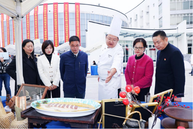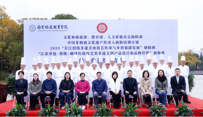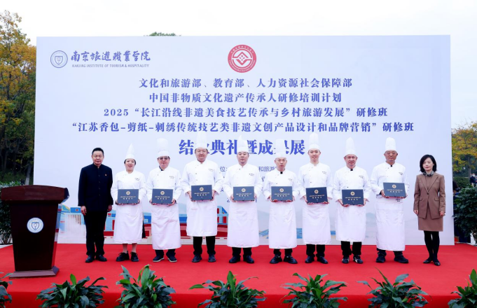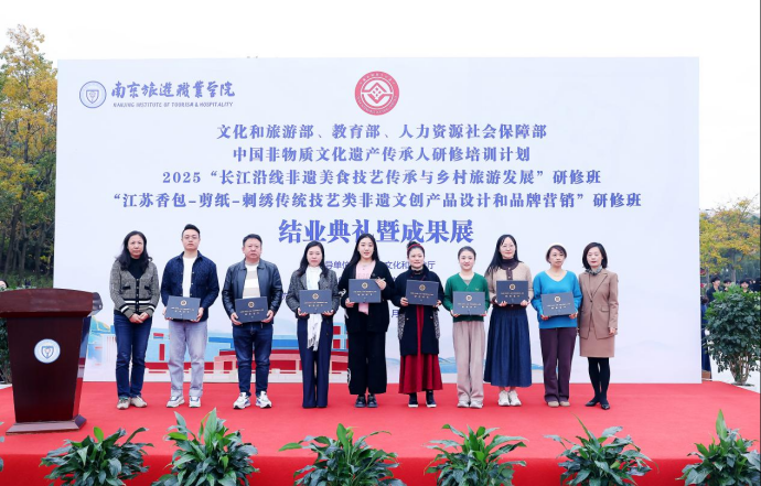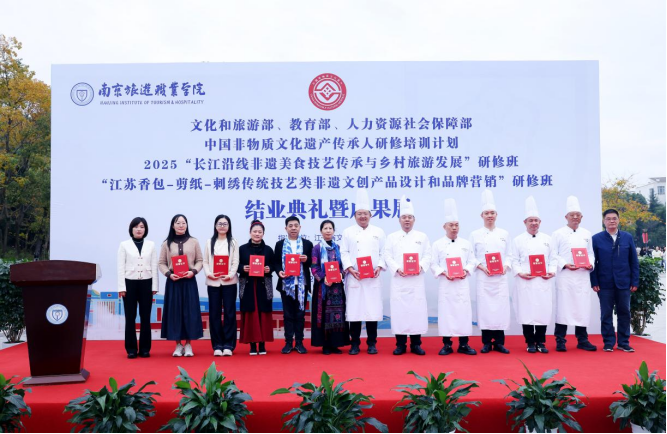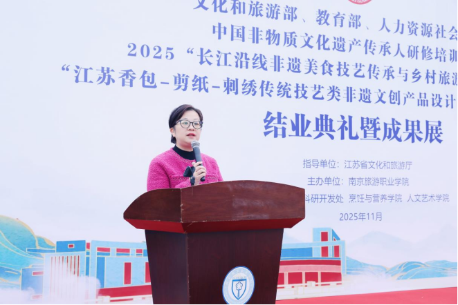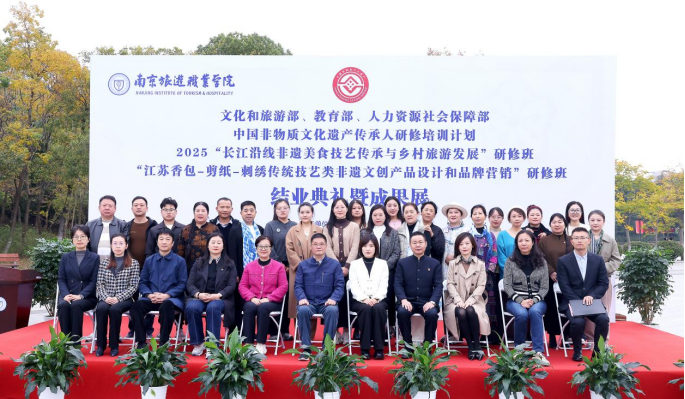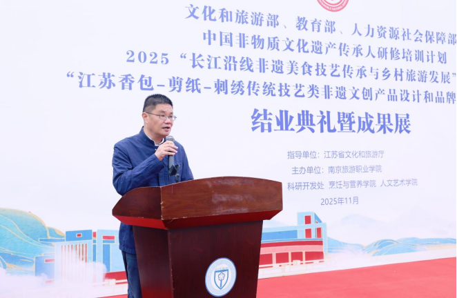 11月6日上午,由文化和旅游部、教育部、人力资源社会保障部联合实施的“中国非物质文化遗产传承人研修培训计划”——2025年“长江沿线中餐烹饪技艺传承与乡村旅游发展”暨“江苏香包、剪纸、刺绣传统技艺类非遗文创产品设计和品牌营销”研修班结业典礼在我们飞燕广场隆重举行。江苏省文化和旅游厅非遗处副处长孔叶萍、江苏省戏剧学校党委委员、副校长周黛瑜,伟德国际victor1946党委书记叶凌波、副院长洪涛等领导出席典礼。典礼由科研开发处副处长张宁主持。