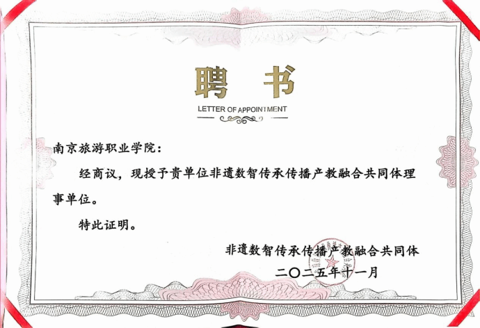 此次受聘理事单位,标志着学院在全国非遗产教融合领域的发展得到进一步肯定,学院将以此为契机,积极履行理事职责,持续深化产教融合、院校协同,推动非遗保护和传承与数智化的深度融合,促进江苏和全国非遗在新时代焕发新生机,为文化强国建设贡献学院力量。