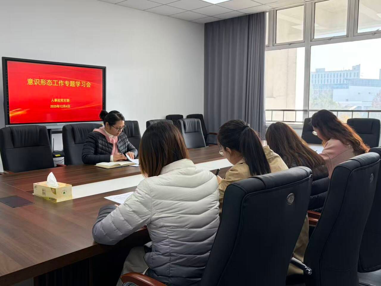 为筑牢意识形态工作思想防线,强化责任担当,12月4日,人事处党支部组织全体党员在行政楼412会议室开展意识形态工作专题学习会。