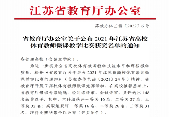 根据《省教育厅办公室关于公布2021年江苏省高校体育教师微课教学比赛获奖名单的通知》(苏教办体艺函〔2022〕6 号),我们体育部倪洁、刘若骞两位老师参加2021年省教育厅举办的江苏省高校体育教师微课教学比赛喜获一个一等奖,...